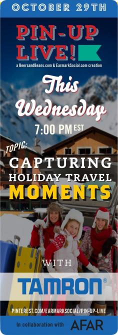 Please join us tomorrow night for a new #PinUpLive chat with Tamron! We'll be chatting about Capturing Holiday Travel Moments so if you've ever wanted to learn some easy tips to improve your photos then come join in the fun! We'll have an AFAR travel photographer on the chat to answer any photo questions you may have AND oh yeah, we're giving away a Tamron lens to one lucky pinner! Visit this board tomorrow night at 7pm EST to join in the fun: www.pinterest.com...