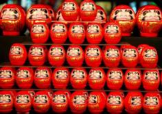 Daruma doll - hollow and round Japanese wish dolls with no arms or legs, modelled after Bodhidharma. Using black ink, one fills in a single circular eye (on the right - for right handers) while thinking of a wish. Should the wish later come true, the second eye is to be filled in.