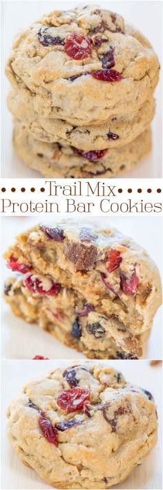 Trail Mix Protein Bar Cookies - Packed with your favorite trail mix goodies, even protein bars!! Soft, chewy, and accidentally healthy!!!