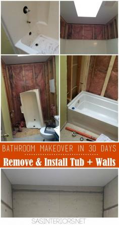 Bathroom Makeover in 30 Days CHALLENGE! Day 2-4 Removing of the existing tub + tub walls & Installing the new tub & cement board in tub area. Follow along on this bathroom makeover and see if this DIY bathroom will be complete in 30 days!