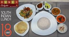 For only AED 18 devour a delicious South Indian Lunch including Fish Curry, Sambar, Rasam, Poriyal, Kootu Curry, Rice, Curd, Pappad, Pickle, Coconut Chutney & more at Dunes Delight!
