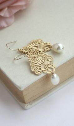 Lace Filigree Gold Earrings Swarovski Ivory Pearl