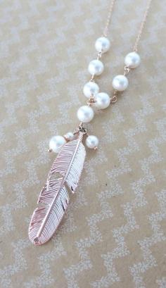 Rose Gold Feather Necklace Swarovski pearl beaded