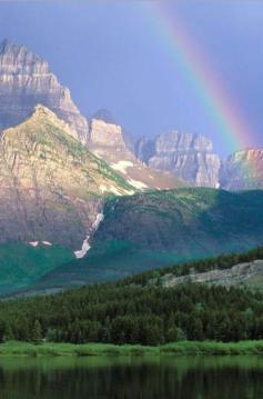 Rainbow over Swiftcurrent Lake, Glacier National Park, Montana, United States.