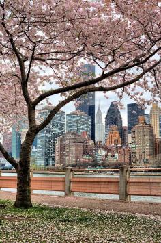 The Spring skyline. The New York City skyline as seen from the cherry tree lined shoreline of Roosevelt Island. NYC. JC Findley