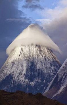 Kliuchevskoi: Un estratovolcán, el la montaña más alta en la península de Kamchatka de Rusia y el volcán activo más alto de Eurasia. Sus empinadas torres de cono simétrico a unos 100 kilómetros del Mar de Bering.