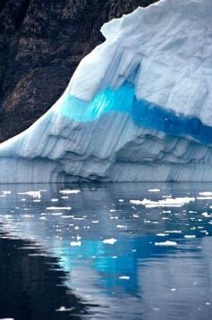 A ribbon of clear blue ice runs through an iceberg and is reflected in the sea. West Greenland