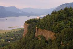 The Crown Point Vista House in the Columbia River Gorge. Beacon Rock is visible in the background, above and to the left of the Vista House; Hamilton Mountain is to the left of Beacon Rock.