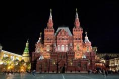 The State Historical Museum of Russian history anchors one end of Red Square in Moscow. It features exhibits from prehistoric inhabitants through the Romanov dynasty.