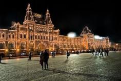 By night, the famous GUM Department Store in Moscow's Red Square, is illuminated with thousands of brilliant white lights.