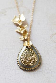 Large Carved Pendant Gold Cascading Orchids Necklace