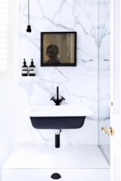 Black and white bathroom with marble walls