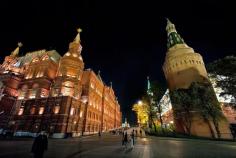 The gorgeously illuminated State Historical Museum and Kremlin, with St. Basil's Cathedral in the distance, by night at Moscow Red Square