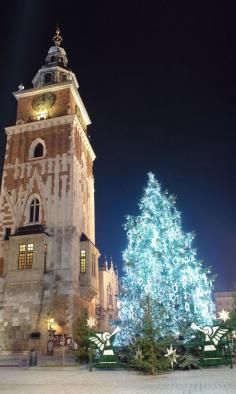 Giant christmas tree illuminated at night standing next to historical Town Hall tower on the Main Market Square in Krakow, Poland | 25 Impressive photos of Christmas celebrations around the World. #17 Is Awesome!