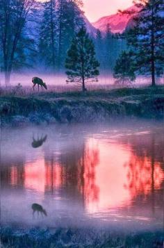 Elk drinking on lake, Yosemite National Park, California, United States.