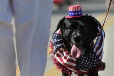 Rascal, a mixed breed rescue dog from the Oshkosh Area Humane Society, takes part in Oshkosh's 4th of July parade on Thursday. Rascal's owner, Jackie Phillips, runs an online dog costume shop.
