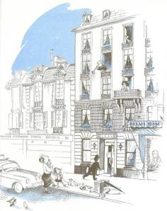ELOISE IN PARIS~ Eloise stays at Relais Bisson at 37 Quai des Grands Augustins. The hotel is no longer there, but in the 50s it was considered a chic place to stay. ~Kay Thompson got a free stay in return for depicting the 25-room, elevator-less hotel in the book. Hilary Knight drew it from life, with its central balcony opening towards the Seine (He also shows the “Librairie Académique Perrin – Éditeur” next door at No. 35: a venerable publishing house, also vanished