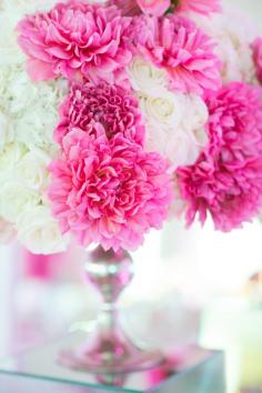 Clusters of soft white roses and electric pink dahlias bring a delightful dose of cheery colour to @Four Seasons Hotels and Resorts Resort The Biltmore Santa Barbara tablescapes.