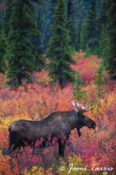 Visit Alaska. A bull moose in the colorful autumn foliage of Alaska (Denali National Park) copyright Jami Tarris