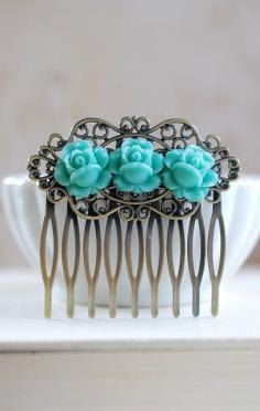 Blue Rose Hair Comb. Trio Blue Roses Brass Filigree