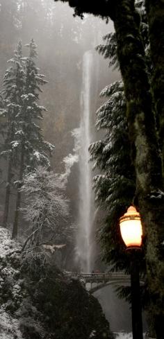 Lamplit, dusky winter scene at Multnomah Falls in the Columbia River Gorge of Oregon (30 mi. east of Portland), United States. • photo: Synapped.