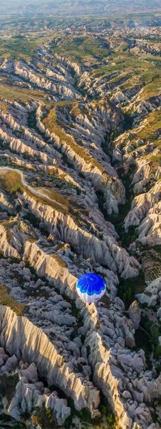 Balloon flying over eroded landscape, Cappadocia, Turkey