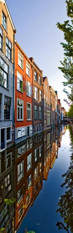 Reflections of homes in a canal of Delft, Netherlands