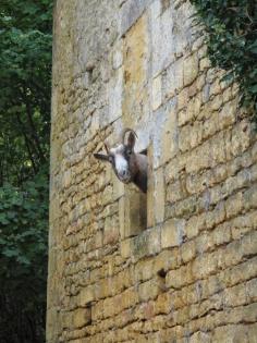 A goat peeking out of a window of the Chateau Pierrelacy (16th century) in the Dordogne, France