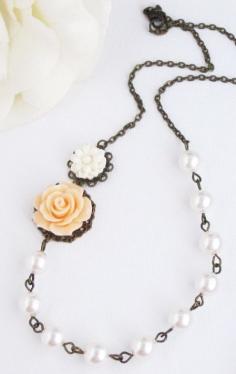 White and Peach Flowers, White Swarovski Pearls Necklace
