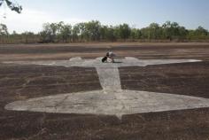 Darwin Australia - Man with dog standing over a painted shape of an aircraft #australia #darwin #fun #thingstodo #history #outback #4wd #desert #worldwarii #travel #traveltherenext