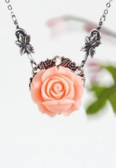 Peach Rose and Silver Leaves Necklace