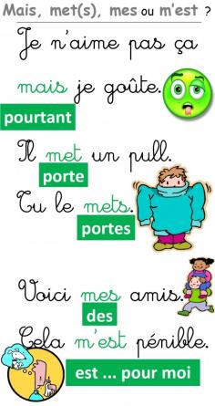 Affiche pour les homophones mais/met(s)/mes et m'est