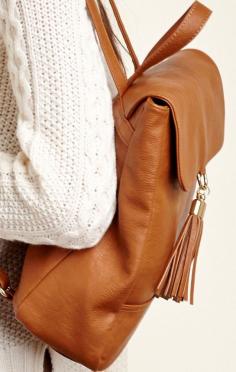 A vegan leather backpack with straps and two front tassels. Includes adjustable shoulder straps.