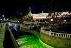 Fountains of Alexandrovsky Gardens by night, with illuminated Kremlin as a backdrop, just outside of Red Square in Moscow, Russia