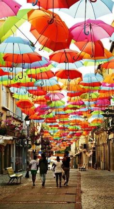 Hundreds of Floating Umbrellas Above a Street in Agueda, Portugal