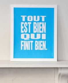 Bold and bright French typographic print made in the UK. Would look lively on any wall. Translates to mean All's Well That Ends Well. Screen printed onto 100% recycled 280gsm paper stock