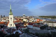 View of St. Martin's Cathedral and city of Bratislava Slovakia from atop Castle Hill at sunset