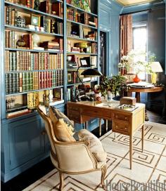 Room of the Day ~ The library in designer Garrow Kedigian's Manhattan apartment sheds fresh light on the classics he collects, both literary and decorative. A bergère in Pierre Frey's Dune partners with a mid-20th-century inlaid desk. Custom Stark rug with the designer's hallmark Greek key pattern.