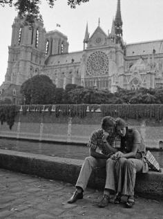 A couple embraces in front of the Notre Dame, Ile-de-France, 1970