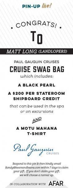 Congratulations to Matt Long (LandLopers) - you were this week's lucky recipient of the Paul Gauguin Cruises Swag Bag! Hooray! Thanks for coming to #pinuplive!