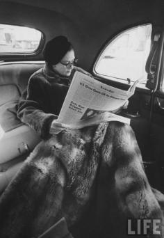 Newsday publisher Alicia Patterson reading her newspaper in backseat of her chauffeur-driven limousine, with large fur lap robe covering her legs, en route to LI office from NYC. Long Island, NY (1958). LIFE. Great-granddaughter of Joseph Medill, owner of the Chicago Tribune, Patterson found her calling late in life when her third husband, Harry Guggenheim, used $750,000 of the Guggenheim family’s fortune to help found the Nassau Daily Journal, also known as Newsday. books0977.