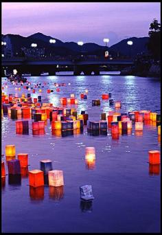Hiroshima, Japan - Lanterns at Twilight. On the anniversary of the bombing of Hiroshima (August 6th), lanterns are sent floating along the Motoyasu-gawa River.