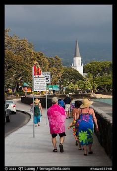 Beachgoers walking past ironman triathlon sign, Kailua-Kona. Hawaii, USA