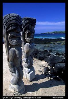 Statues of polynesian idols, Puuhonua o Honauau National Historical Park. Big Island, Hawaii, USA