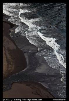 Surf and black sand beach from above, Waipio Valley. Big Island, Hawaii, USA