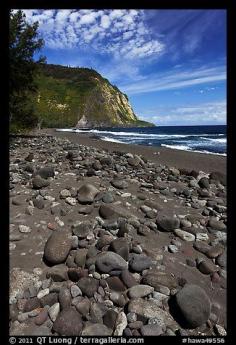 Rocks and black sand beach, Waipio Valley. Big Island, Hawaii, USA