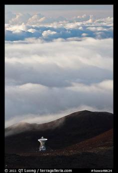 Astronomic radio antenna and sea of clouds. Mauna Kea, Big Island, Hawaii, USA