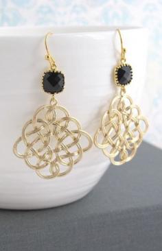 Jet Black Gold Plated, Gold Chandelier Filigree Earrings