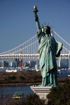 Copy of Statue of Liberty, Rainbow Bridge in the background, Odaiba, Tokyo. Image by Simon Richmond / Lonely Planet