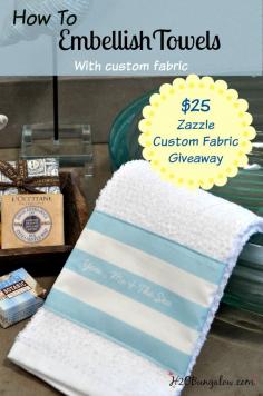I share how to embellish towels with fabric in a few easy steps using Zazzle custom fabric. Easy project makes a great gift or pretty in your own home. H2OBungalow.com